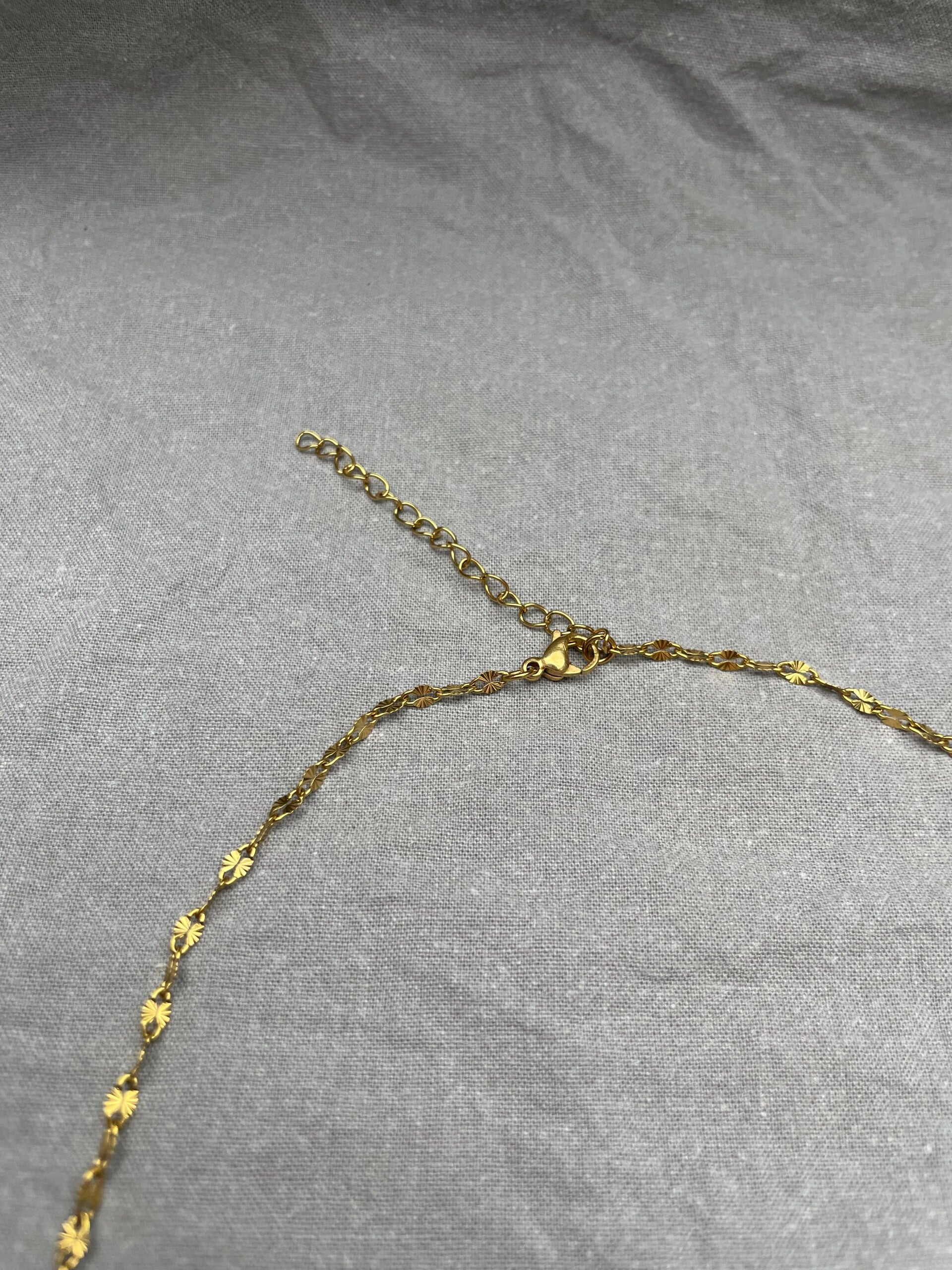 Halskæden er lavet i PVD-belagt 14 og 18 karats forgyldt stål, hvilket gør den vandfast (læs vilkår i handelsbetingelserne).